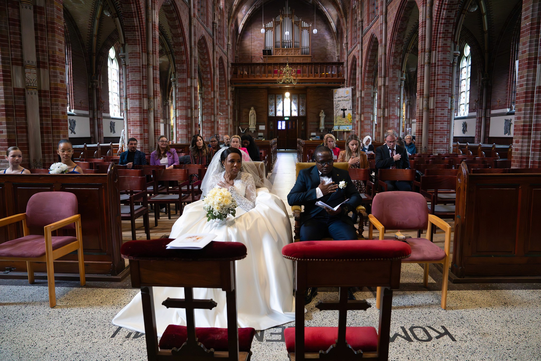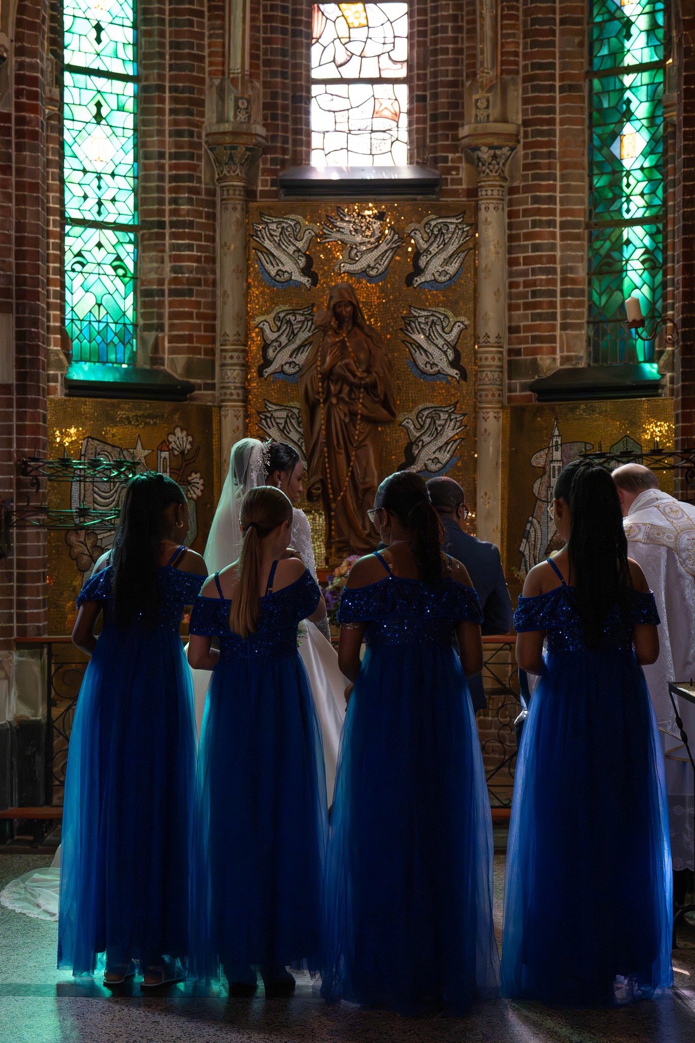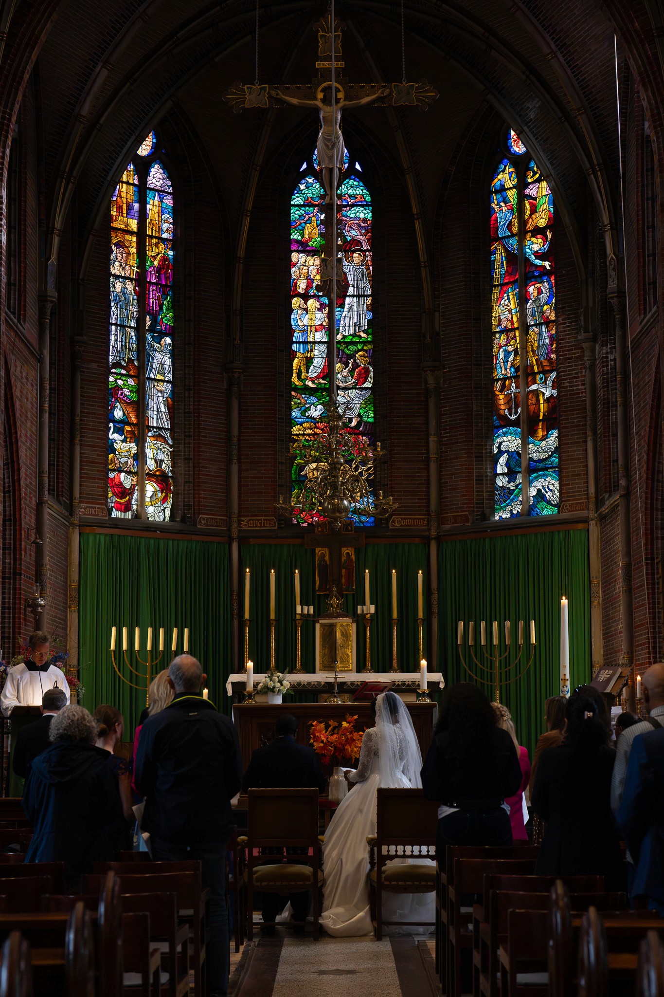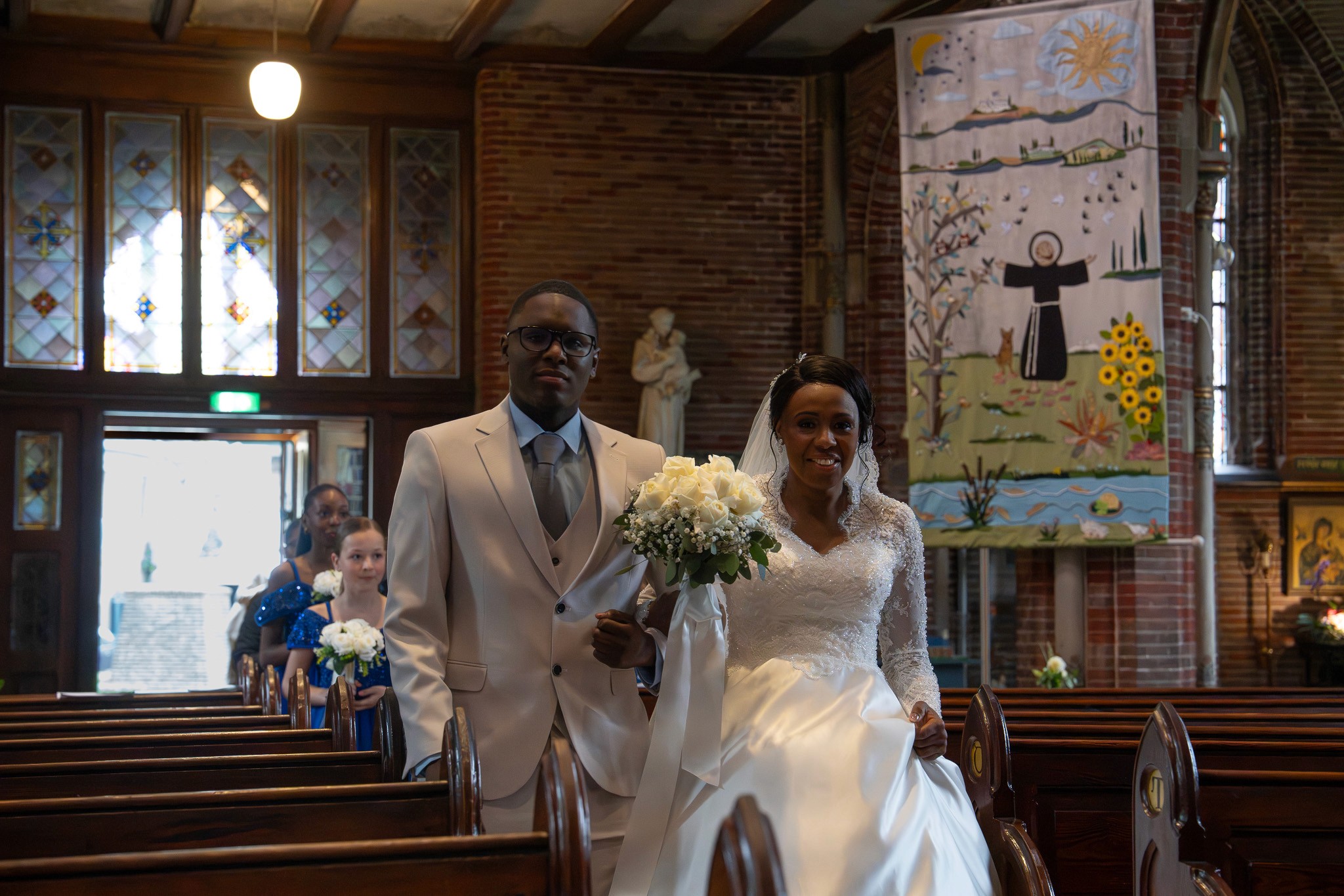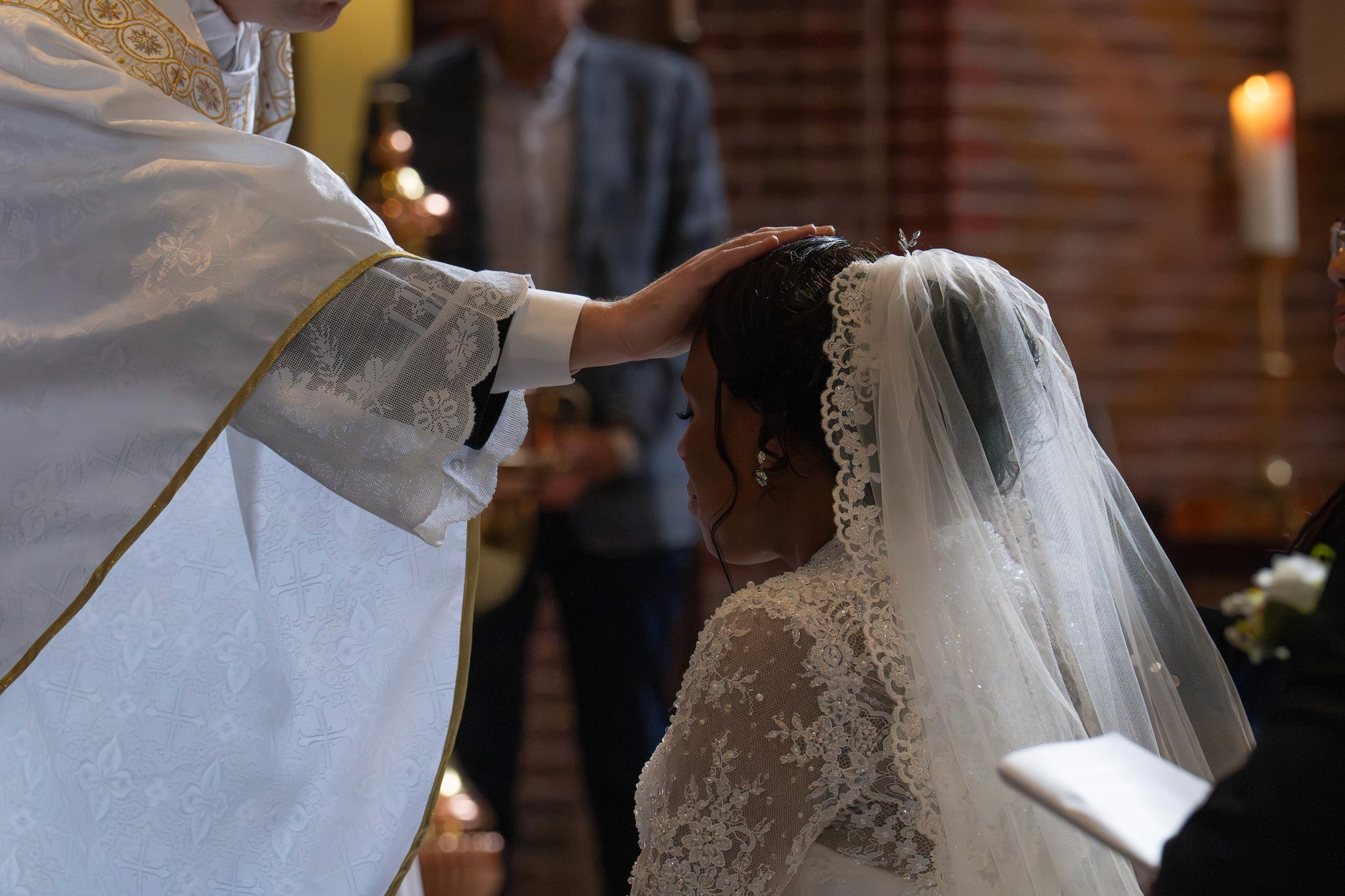 De ceremonie vond plaats in een prachtige Katholieke Kerk, waar het geloof een centrale rol speelde in hun liefde en toewijding.